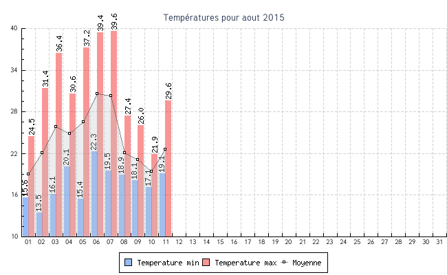 | 07 | 19.5 °C | 39.6 °C | 30.3 °C | 3.9 km/h (22.7 km/h) | SSE |
