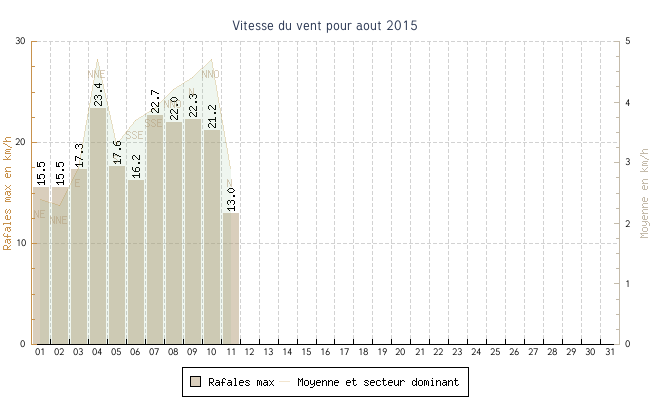| min | max | moy | Vitesse (rafales) | Secteur | ||